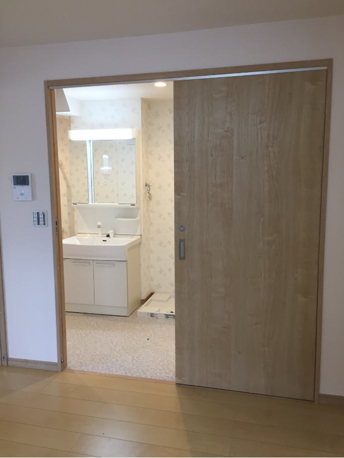 水廻りへは行き来しやすいようにリビングから出入りできる引戸を新設しました