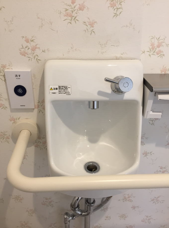 大きなL字型の手摺と密接して手洗い器を設置することで